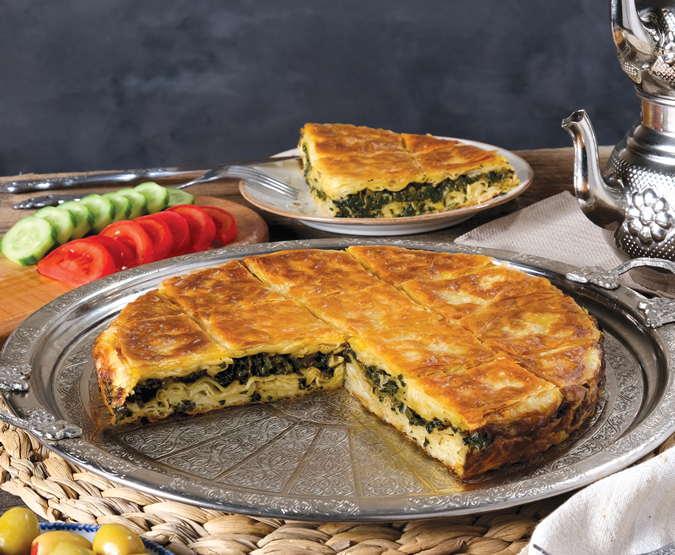 Ispanaklı Börek : El açması kat kat baklava hamuru içinde; sirkeli su ile yıkanmşı ıspanaklı özel iç harç ve Urfa’dan saf tereyağ ile hazırlanır.