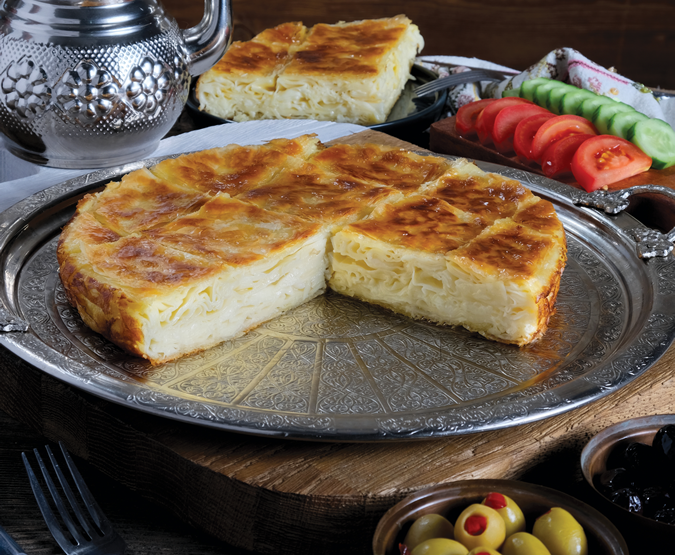 Peynirli Börek : El açması kat kat baklava hamuru içinde; Antep peynirli özel iç harç ve Urfa’dan saf tereyağ ile hazırlanır.
